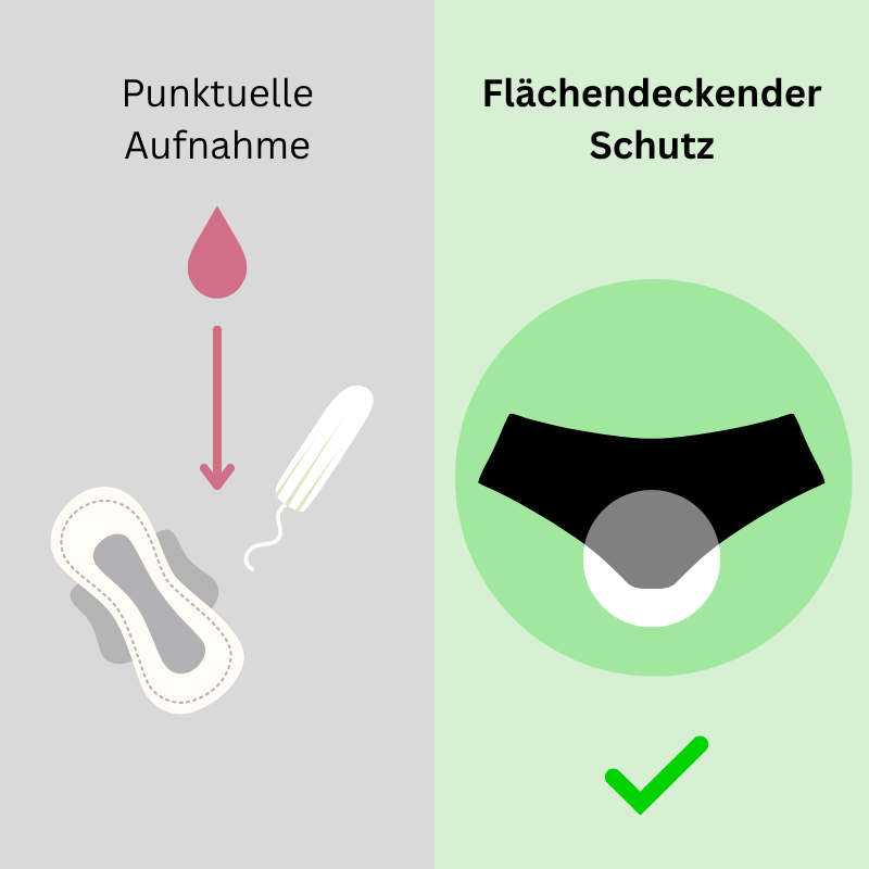 Im Gegensatz zu Tampons oder Binden, die Flüssigkeit nur punktuell aufnehmen, bietet die Taynie Deluxe Ultra flächendeckenden Schutz. Die mehrschichtige Funktionsstruktur nimmt Flüssigkeit über eine große Fläche auf und schließt sie sicher ein – mit einer Kapazität von bis zu 7 Tampons oder 3,5 Binden. Kein Auslaufen, keine Überraschungen, keine ständige Angst mehr. Endlich kannst Du Dich auf Deinen Tag konzentrieren, statt permanent zu kontrollieren.