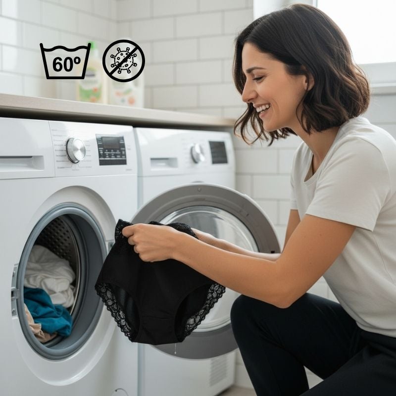 Die meisten Periodenunterwäsche-Hersteller erlauben nur 30-40 °C, doch die Periodenunterwäsche von Taynie kannst Du bei bis zu 60 °C waschen. Nach dem Tragen einfach kurz kalt ausspülen und ab in die Maschine – 40 °C reichen für die Langlebigkeit, aber 60 °C sind möglich für besonders hygienische Reinigung. Diese höhere Temperatur entfernt Bakterien und hartnäckige Gerüche deutlich effektiver. Das Besondere: Taynie setzt auf Materialien, die diese Temperatur ohne Biozide oder Silberionen aushalten.